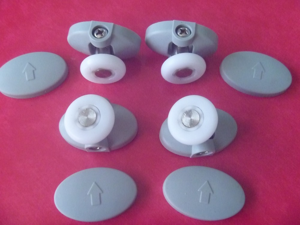 23mm Single wheel, grey finnish twin fitment quadrant rollers. Sold as four units - 4 X upper (distance between fitting hole centres 26.00mm