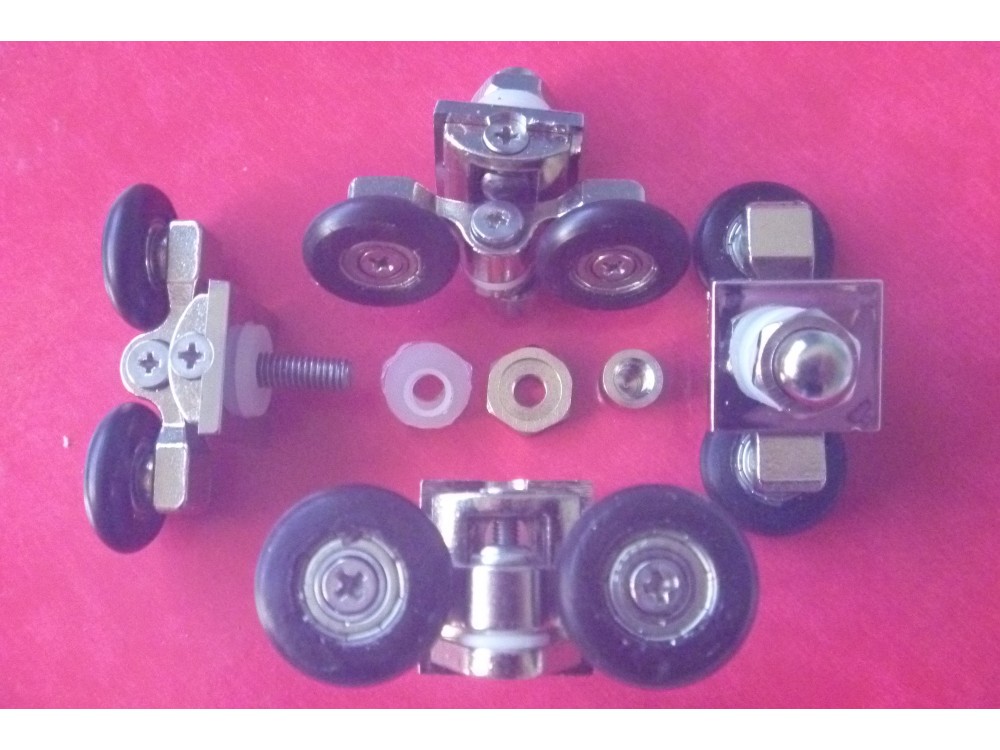 this is a set of four twin wheeled 25.0 mm diameter wheel heavy duty height adjustable shower door quadrant roller units to suit a fitting hole size of 8.00mm .
